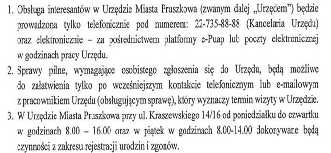 Szanowni mieszkańcy, od dnia 24.03.br. zmienia się sposób pracy i obsługi mieszkańców w Urzędzie Miasta Pruszkowa.