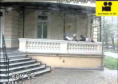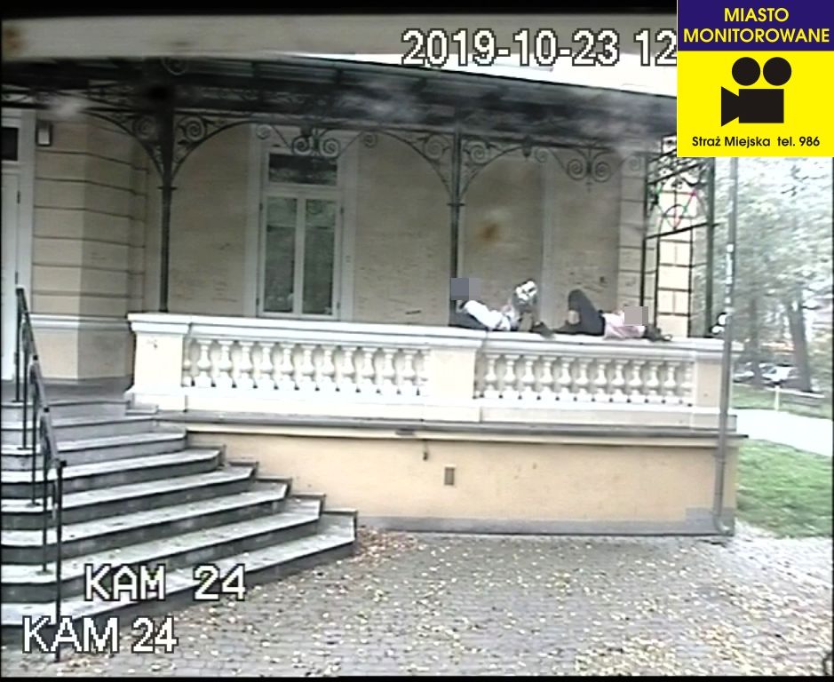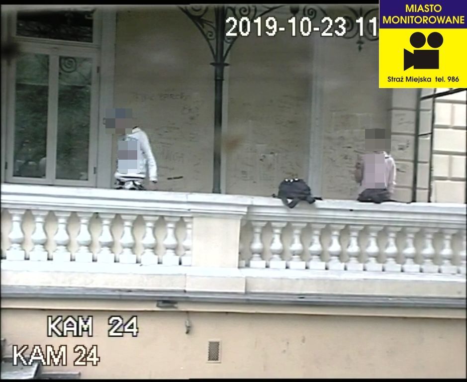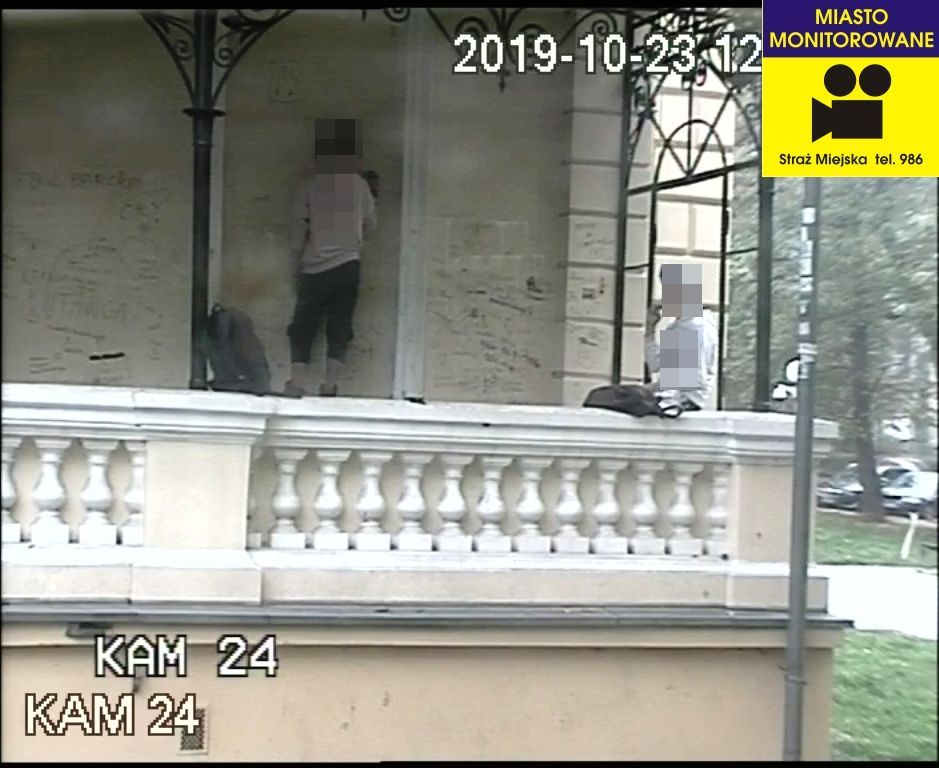W dniu wczorajszym (23.10.br.) w samo południe, operatorzy monitoringu miejskiego, zwrócili uwagę na dwóch młodych chłopców. Ich zachowanie spowodowało skierowanie w ich kierunku pobliskiej kamery. Nastolatkowie wdrapywali się na elewację pałacyku, dokonując jej zabrudzenia. Podczas obserwacji, dyżurny zaobserwował również fakt naniesienia napisów i rysunków.