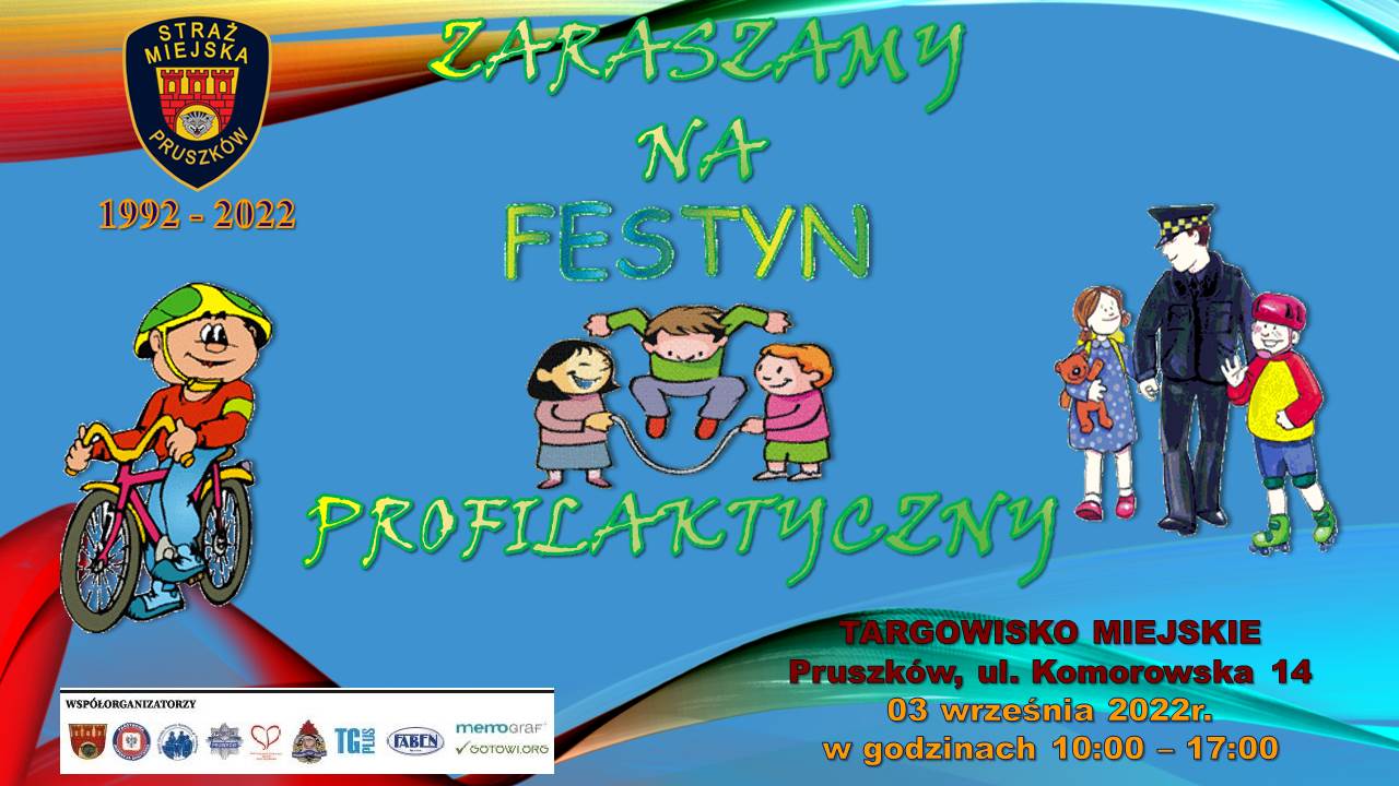 We wrześniu 2022 roku pruszkowska Straż Miejska obchodzić będzie 30 rocznicę powołania. To dobra okazja do spotkania z Mieszkańcami naszego miasta. W dniu 3 września 2022 roku zapraszamy do udziału w „FESTYNIE PROFILAKTYCZNYM”, który odbędzie się na terenie Targowiska Miejskiego w Pruszkowie przy ulicy Komorowskiej 14 w godzinach 10-17.