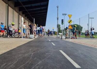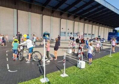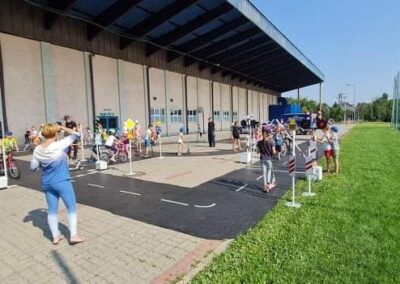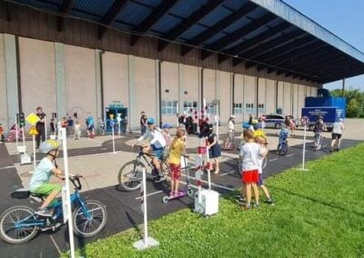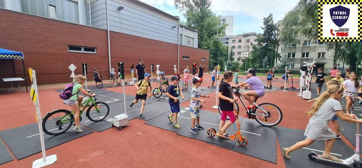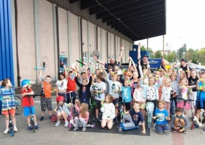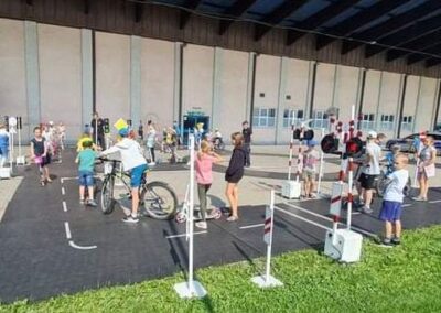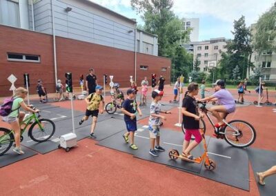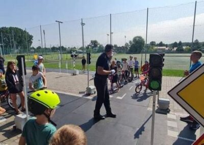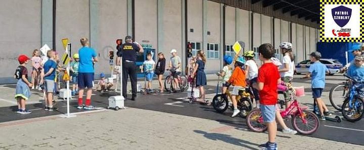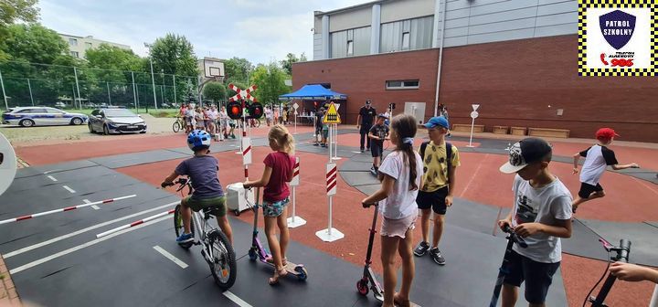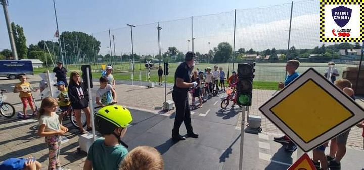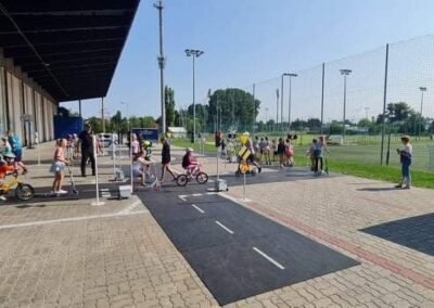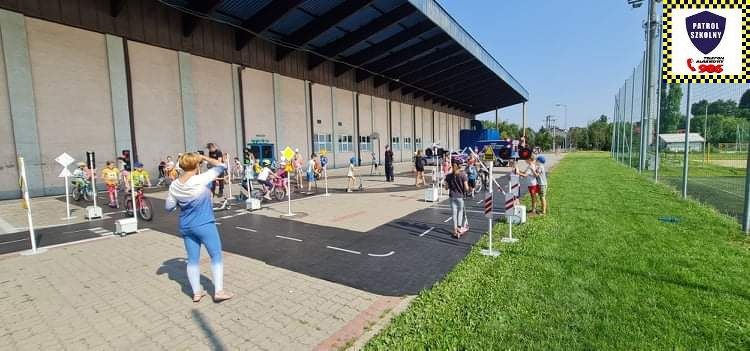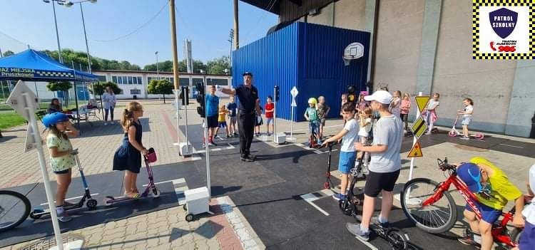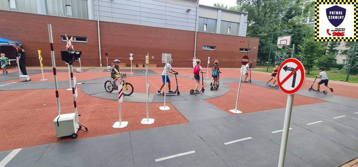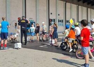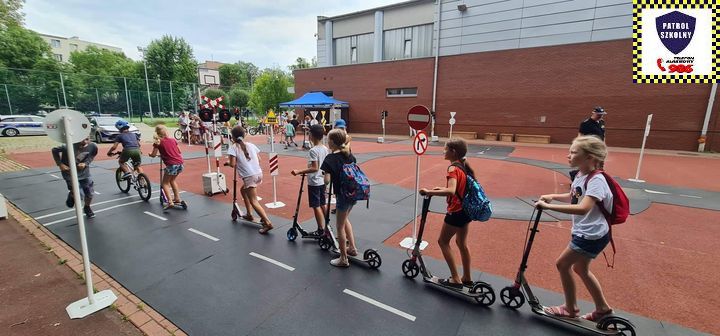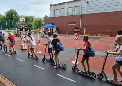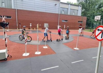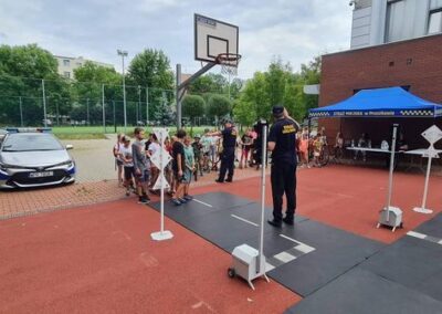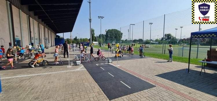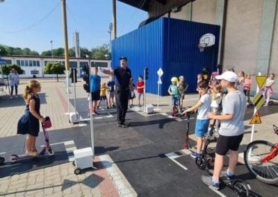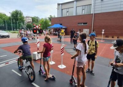 Kolejnym zagadnieniem poruszanym w trakcie spotkań z dziećmi, były kwestie związane z bezpieczeństwem w Ruchu Drogowym. Zajęcia odbywały się na specjalnie w tym celu rozstawionym Mobilnym Miasteczku Ruchu Drogowego, którym dysponuje Straż Miejska w Pruszkowie. Podczas zajęć, dzieci miały możliwość zapoznać się z podstawowymi przepisami regulującymi ruch na drodze. Miasteczko jest wyposażone we wszystkie niezbędne elementy symulujące prawdziwy ruch drogowy, tj. skrzyżowania, rondo, przejście dla pieszych, sygnalizację świetlną czy przejazdy kolejowe z zaporami. W związku z tym uczestnicy bawiąc się, napotykali najróżniejsze sytuacje, które mogą zaistnieć na prawdziwej drodze. Funkcjonariusze referatu profilaktyki Straży Miejskiej w Pruszkowie, nadzorując zabawy na terenie Miasteczka, instruowali uczestników o obowiązujących przepisach, ucząc ich jednocześnie właściwego zachowania się na drodze.