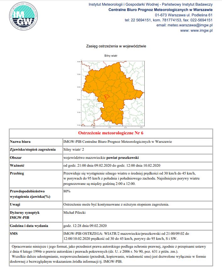 Instytut Meteorologii i Gospodarki Wodnej – Państwowy Instytut Badawczy wydał OSTRZEŻENIE II STOPNIA. od godz. 21:00 dnia 09.02.2020 do godz. 12:00 dnia 10.02.2020.