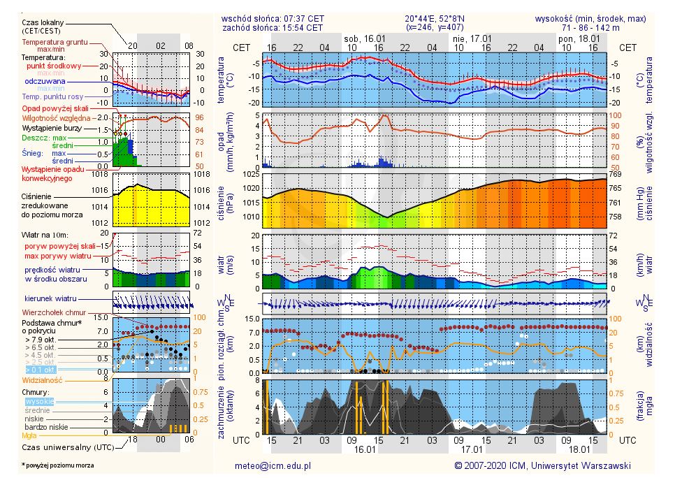 Opis: Prognozuje się temperaturę minimalną w nocy od -20°C do -18°C. Temperatura maksymalna w dzień od -6°C do-2°C. Prognozowana średnia prędkość wiatru od 12 km/h do 15 km/h. - Od: Niedziela 17.01 07:30 Do: Poniedziałek 18.01 07:30