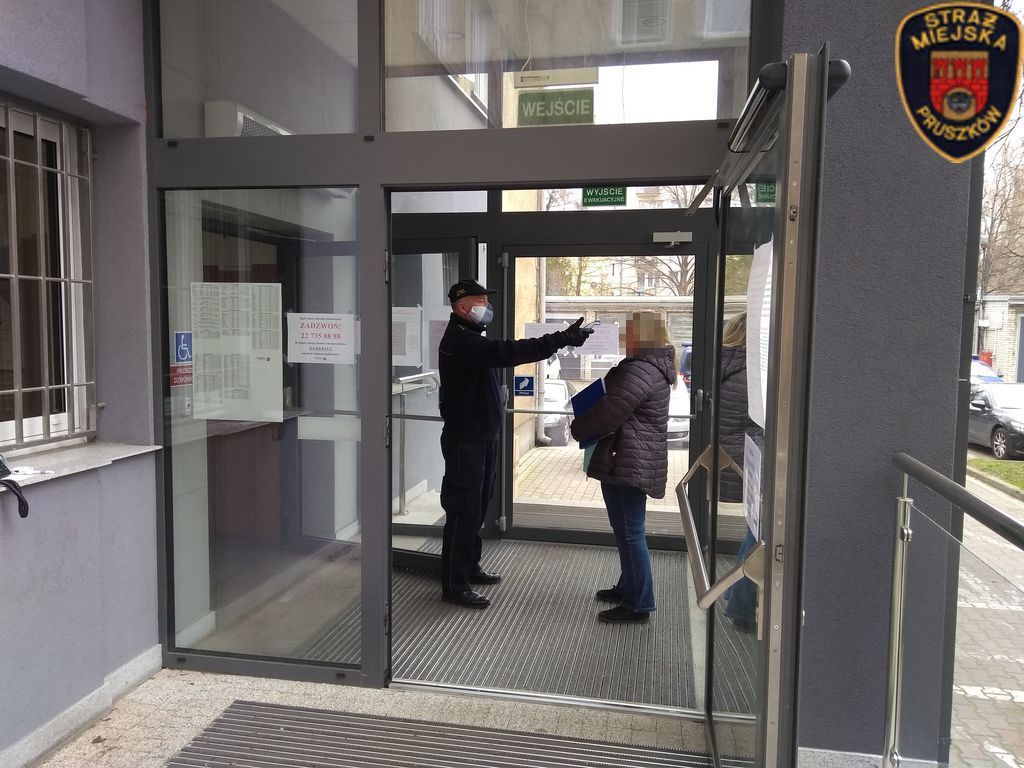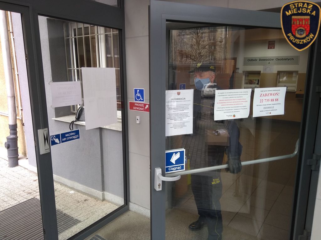 Realizując Zarządzenie nr 65/2020 Prezydenta Miasta Pruszkowa w okresie od piątku 13 marca 2020 r. do odwołania, wszyscy interesanci obsługiwani są w tymczasowym Biurze Obsługi Mieszkańców na parterze budynku, po wcześniejszej konsultacji z właściwym merytorycznie wydziałem, a następnie kontroli, którą prowadzą strażnicy w elementach ochrony osobistej – pomiar temperatury ciała bezdotykowym termometrem, dezynfekcja rąk płynem odkażającym, izolacja w bezpiecznej odległości od pozostałych osób.