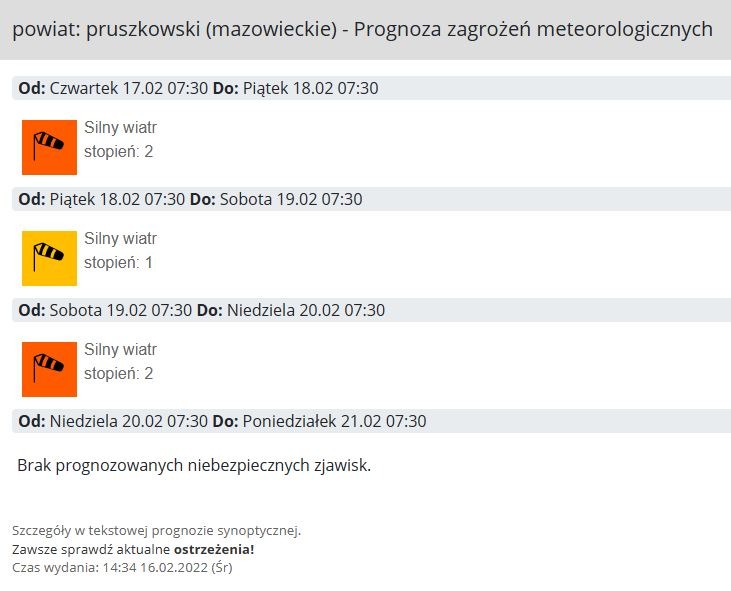 W związku z prognozowanym silnym wiatrem, Alert RCB o treści: „Uwaga! Dziś i jutro (16/17.02) silny wiatr. Możliwe przerwy w dostawie prądu i trudne warunki na drogach. Zostań w domu, jeśli możesz”, został wysłany do mieszkańców całego kraju. Prognozowany jest silny wiatr o średniej prędkości od 40 km/h do 50 km/h, którego porywy mogą osiągać nawet 120 km/h.