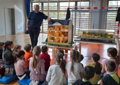 Uczniowie klas 0-3 z wypiekami na twarzach obserwowali symulowane pożary poszczególnych pomieszczeń na pierwszej części symulatora, którym jest dom mieszkalny, oraz na drugim module prezentującym przyczyny i skutki pożarów lasu. W trakcie zajęć przy module „las”, uczniowie zapoznawali się również z typowymi zagrożeniami charakterystycznymi dla okresu wakacyjnego, takimi, jak kąpiele z miejscach niestrzeżonych, rozpalanie ognisk w miejscach niedozwolonych, czy zagrożenia związane z bezpieczeństwem ruchu drogowego. Podjęcie tych zagadnień umożliwia moduł symulatora pożaru lasu. W trakcie warsztatów wspólnie z funkcjonariuszami, uczniowie analizowali przyczyny pożarów i poznawali metody zapobiegania tego typu zdarzeniom.