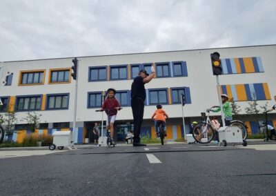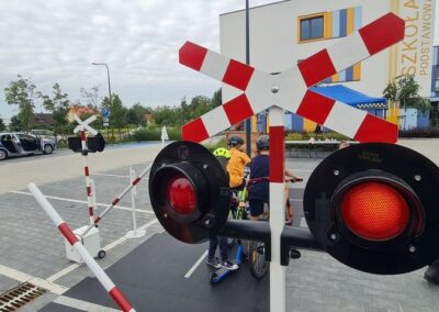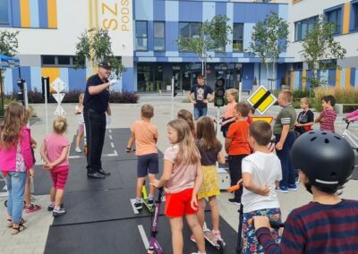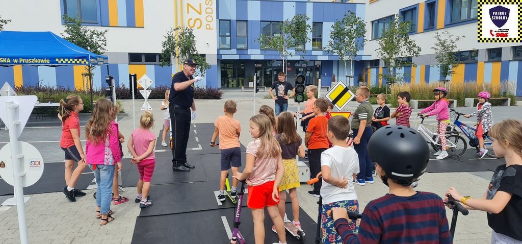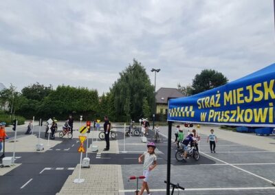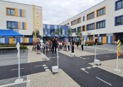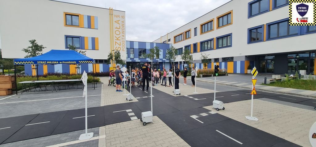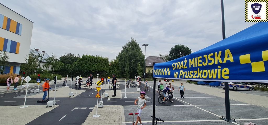 Jednak największą atrakcją były zajęcia z Ruchu Drogowego. Uczniowie nie mogli się wręcz doczekać wyjścia na specjalnie w tym celu rozstawione Mobilne Miasteczko Ruchu Drogowego. Na terenie Miasteczka uczestnicy zapoznawali się z podstawowymi zasadami, które obowiązują w Ruchu Drogowym. Mobilne Miasteczko Ruchu Drogowego wyposażone jest w podstawową infrastrukturę symulującą realne elementy każdej drogi, czyli rondo, skrzyżowanie, przejścia dla pieszych, sygnalizację świetlną, oraz odpowiednie oznakowanie. Uczestnicy zapoznawali się z najróżniejszymi sytuacjami, które mogą wystąpić w Ruchu Drogowym, nabierali odpowiednich nawyków związanych z przestrzeganiem przepisów, radzili sobie w trakcie sytuacji , które były zdarzeniami o charakterze losowym. Nad przebiegiem zajęć oraz bezpieczeństwem uczestników czuwali Funkcjonariusze Straży Miejskiej w Pruszkowie.