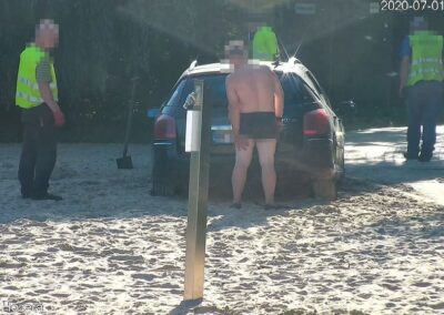 Kiedy strażnicy dojechali na miejsce, kierowca Peugeota, nie potrafił wyjaśnić swojego zachowania – wjazdu na plażę, nie posiadał także przy sobie dokumentów uprawniających do kierowania pojazdami. Strażnicy od mężczyzny wyczuwali woń alkoholu, a sam 46-latek, przyznał się do spożywania alkoholu. Peugeot został zabezpieczony przed dalszą jazdą, a na miejsce wezwano policjantów pruszkowskiej Komendy Powiatowej Policji, którzy zatrzymali Grzegorza D. do dalszych czynności. Wstępne badanie, potwierdziło zawartość alkoholu w wydychanym powietrzu przez, a kolejne czynności, które przeprowadzili policjanci, ujawniły ponad 0,5 promila alkoholu w wydychanym powietrzu.