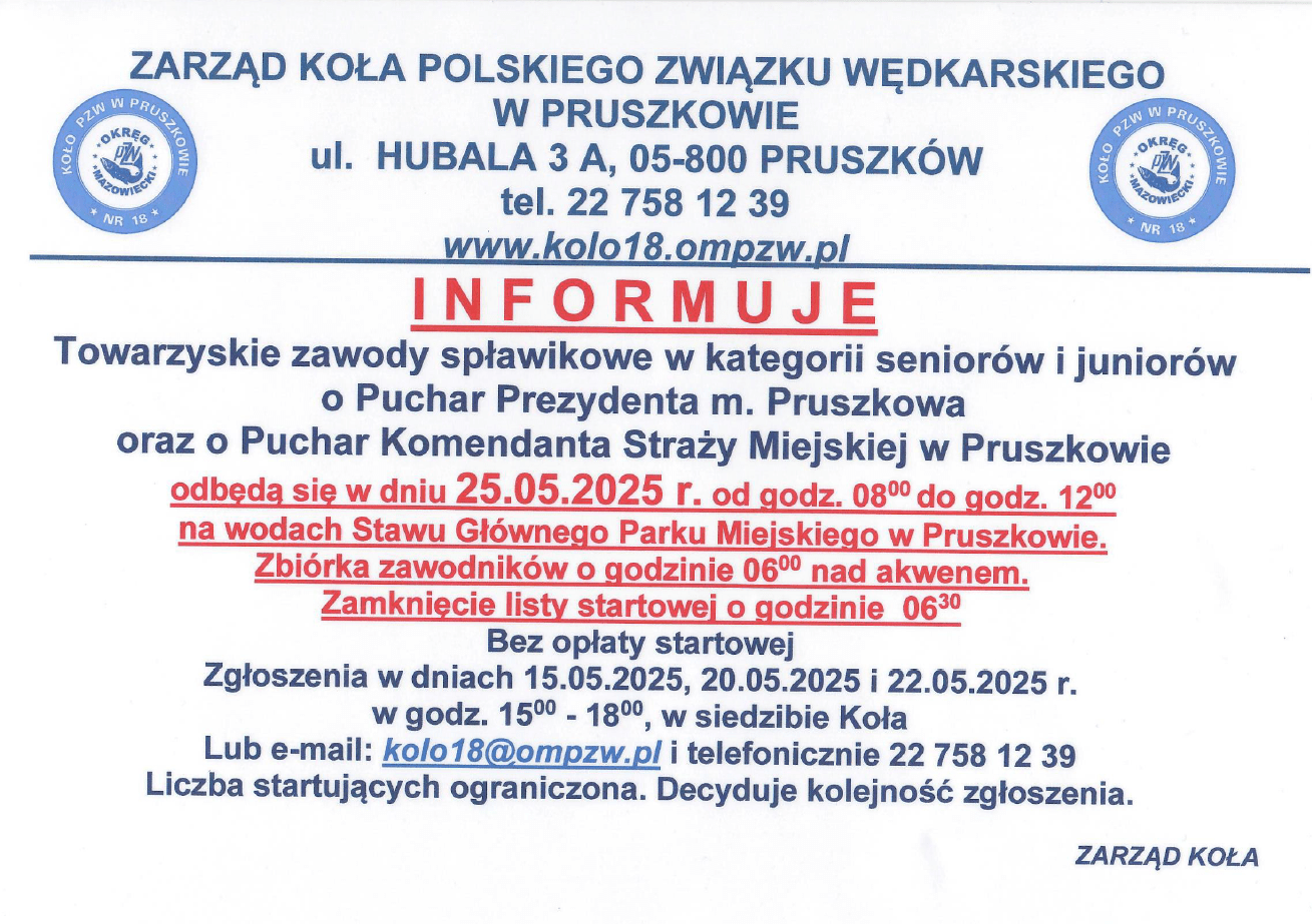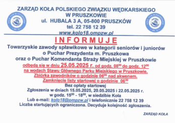 W dniu 25 maja 2025r., na terenie głównego stawu w Parku Miejskim Potulickich, odbędą się Towarzyskie Zawody Spławikowe o „Puchar Prezydent Miasta Pruszkowa” oraz „Puchar Komendanta Straży Miejskiej w Pruszkowie”.