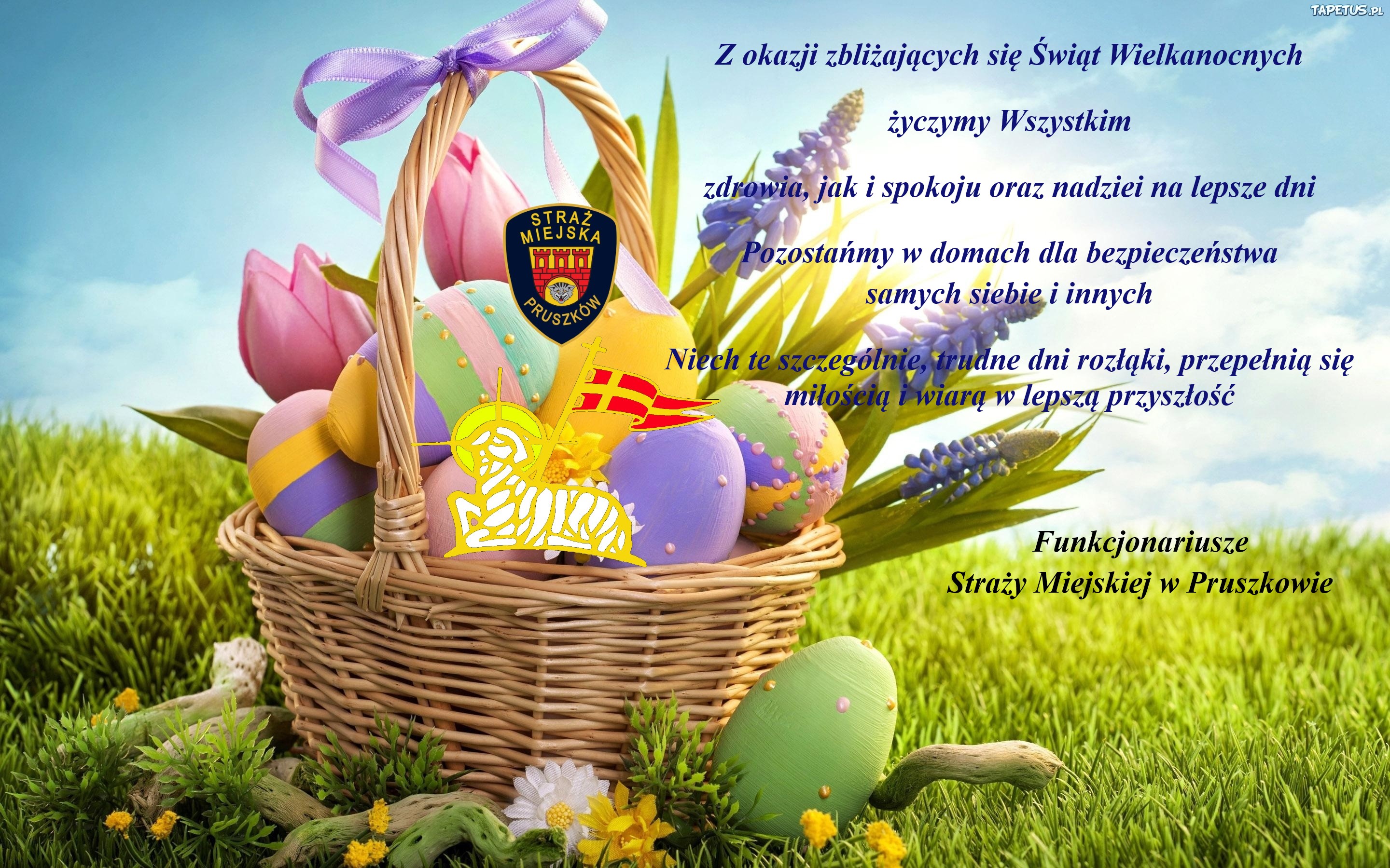 W tym trudnym dla nas wszystkich czasie, przekazujemy Państwu życzenia od strażników, strażniczek i pracowników Straży Miejskiej w Pruszkowie. Prosimy aby Państwo pozostali w swoich domach abyśmy mogli w zdrowiu i bezpieczeństwie dotrwać lepszych dni. Zdrowych, spokojnych i bezpiecznych Świąt Wielkanocnych.